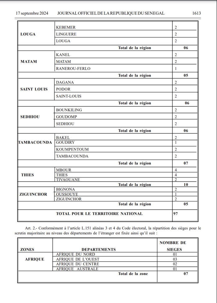 Par dérogation aux dispositions de l’article LO.190 du Code électoral, les électeurs sénégalais établis sur le territoire national et ceux résidant à l’étranger sont convoqués le dimanche 17 novembre 2024 pour l’élection des députés. Dans le Journal officiel, il est informé que le scrutin est ouvert à 8 heures et clos le même jour à 18 heures. Toutefois, pour faciliter aux électeurs l’exercice de leur droit de vote, le Gouverneur, le Préfet ou le Sous-préfet peut prendre un arrêté afin de retarder l’heure de clôture du scrutin dans l’ensemble ou une partie de la circonscription électorale.