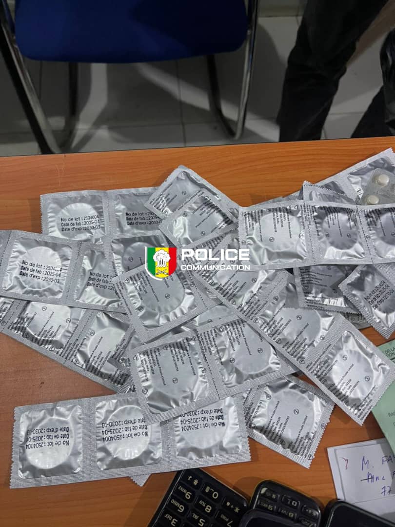 « La perquisition de l’appartement a permis de saisir les éléments suivants : Sept (07) téléphones portables, un carnet sanitaire expiré, un lot de préservatifs, une somme d’argent (produit présumé de l’activité illicite) », explique la police.