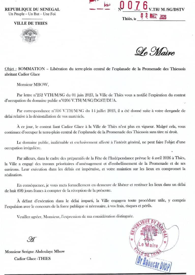 La mairie précise qu’à ce jour, le contrat liant Cadior Glace à la Ville de Thiès n’est plus en vigueur. Malgré cela, le restaurant-glacier continue d’occuper le terre-plein central de l’esplanade de la Promenade des Thiessois sans titre ni droit.